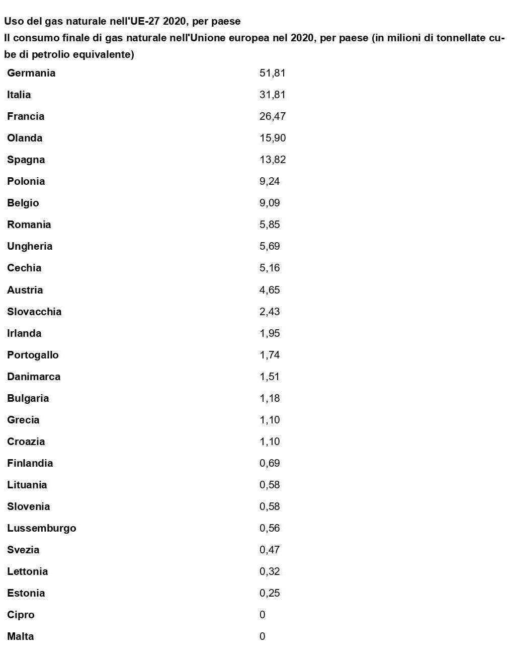 Nel 2020, secondo la Commissione Europea, il consumo di gas per paese in Europa era così diviso: