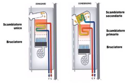 L’utilizzo corretto di una caldaia a condensazione può consentire di ottenere un risparmio energetico rispetto alle caldaie tradizionali (può arrivare al 30% annuo) e un minor inquinamento. La tecnologia utilizzata non sfrutta solo il calore dei fumi prodotti dalla combustione ma permette di recuperare parte del calore contenuto nei gas di scarico sotto forma di vapore acqueo, consentendo un migliore sfruttamento del combustibile e quindi il raggiungimento di rendimenti più alti a cui è associata una riduzione dei consumi. Infatti, mentre nelle caldaie tradizionali i gas residui della combustione sono espulsi ad una temperatura di circa 110°C, nella caldaia a condensazione, prima di essere espulsi, i gas attraversano uno scambiatore di calore, all’interno del quale il vapore acqueo condensa, cedendo parte del calore latente di condensazione all’acqua del circuito primario. Il risultato è che i gas di scarico fuoriescono ad una temperatura di 40°C e viene recuperato il calore che altrimenti sarebbe andato disperso. In questo modo la temperatura dei fumi di uscita risulta essere uguale al valore della temperatura di mandata dell’acqua, ben inferiore quindi ai 140-160°C dei generatori ad alto rendimento ed ai 200-250°C dei generatori di tipo tradizionale. Proprio per le basse temperature dei fumi, le caldaie a condensazione utilizzano canne fumarie in acciaio inox o addirittura in plastica. Esse necessitano anche di un tubo per lo scarico dell’acqua di condensa che si forma durante il loro funzionamento.