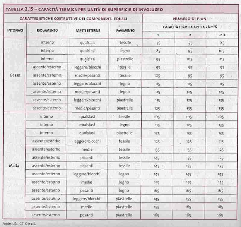 La capacità termica di un materiale descrive la sua attitudine ad accumulare calore che successivamente viene riceduto all’ambiente. Tanto più la capacità termica è elevata tanto meno cambiano le temperature dell’ambiente interno al variare delle temperature esterne. In termini di grandezza termofisica essa è rappresentata dal calore specifico che indica la quantità di calore che 1 metro cubo di materiale può accumulare aumentando di un grado la sua temperatura. Per una variazione Δt di temperatura l’accumulo di calore si può calcolare con la relazione: Q = c • m Δt essendo: c il calore specifico unitario; m la massa unitaria; Δt la variazione di temperatura. La capacità termica dell’insieme di componenti che delimitano un ambiente climatizzato o a temperatura controllata, espressa in [kJ/K], è data da: