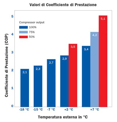 Abbiamo visto sopra come nel corso del suo funzionamento, la pompa di calore: consuma energia elettrica nel compressore; assorbe calore nell’evaporatore, dal mezzo circostante, che può essere aria o acqua; cede calore al mezzo da riscaldare nel condensatore (aria o acqua). Il vantaggio di una pompa di calore deriva dalla sua capacità di fornire più energia di quella elettrica impiegata per il suo funzionamento in quanto estrae calore dall’ambiente esterno (aria - acqua). L’efficienza di una pompa di calore è misurata dal coefficiente di prestazione C.O.P. (Coefficient Of Performance) che esprime il rapporto tra energia fornita ed energia elettrica consumata. Il C.O.P. è variabile a seconda del tipo di pompa di calore e delle condizioni di funzionamento ed ha, in genere, valori prossimi a 3-4, ovvero per 1 kWh di energia elettrica consumato, fornirà 3kW (2580 kcal) di calore al mezzo da riscaldare. Il C.O.P. sarà tanto maggiore quanto più bassa è la temperatura a cui il calore viene ceduto (nel condensatore) e quanto più alta quella della sorgente da cui viene assorbito (nell’evaporatore). Al di sotto di una temperatura compresa tra -2°C e 2°C la pompa di calore si disattiva in quanto le sue prestazioni si ridurrebbero significativamente. Va tenuto conto inoltre che la potenza termica resa dalla pompa di calore dipende dalla temperatura a cui la stessa assorbe calore.