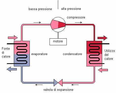 Il compressore di una pompa di calore crea la differenza di pressione che permette al ciclo di ripetersi: esso pompa il fluido refrigerante attraverso l’evaporatore, dove appunto evapora a bassa pressione assorbendo calore dall’esterno (da aria, terra, acqua), in seguito lo comprime e lo spinge all’interno del condensatore, dove condensa ad alta pressione rilasciando il calore precedentemente assorbito all’esterno. Il fluido refrigerante cambia di stato all’interno dei due scambiatori di calore: nell’evaporatore passa da liquido a gassoso, nel condensatore passa da gassoso a liquido.