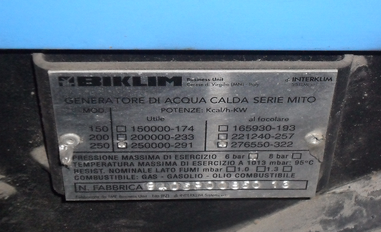 Anno di costruzione 1993. Potenza termica nominale utile KW 581,4. Potenza termica al focolare kW 643,1 - Biklim modello TS1
